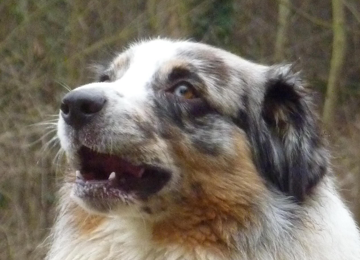 Aussie wir in Blue Merle – der Hund ist schwarz gefleckt mit